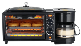 This all-in-one kitchen appliance combines a toaster oven, coffee maker, and griddle pan — giving you everything you need to prepare a full breakfast in one compact device!